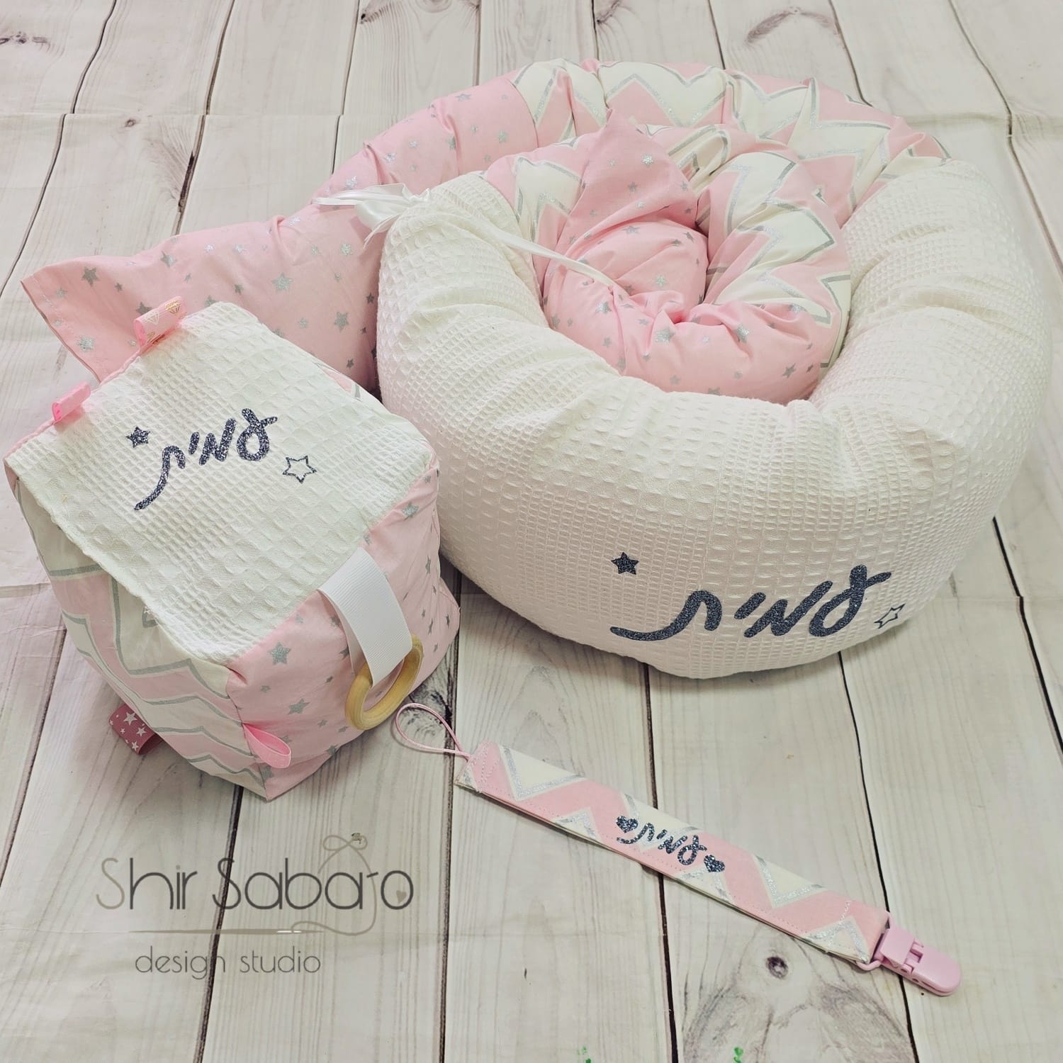 כל פריט מעוצב ומודפס שם התינוק בעברית או אנגלית.