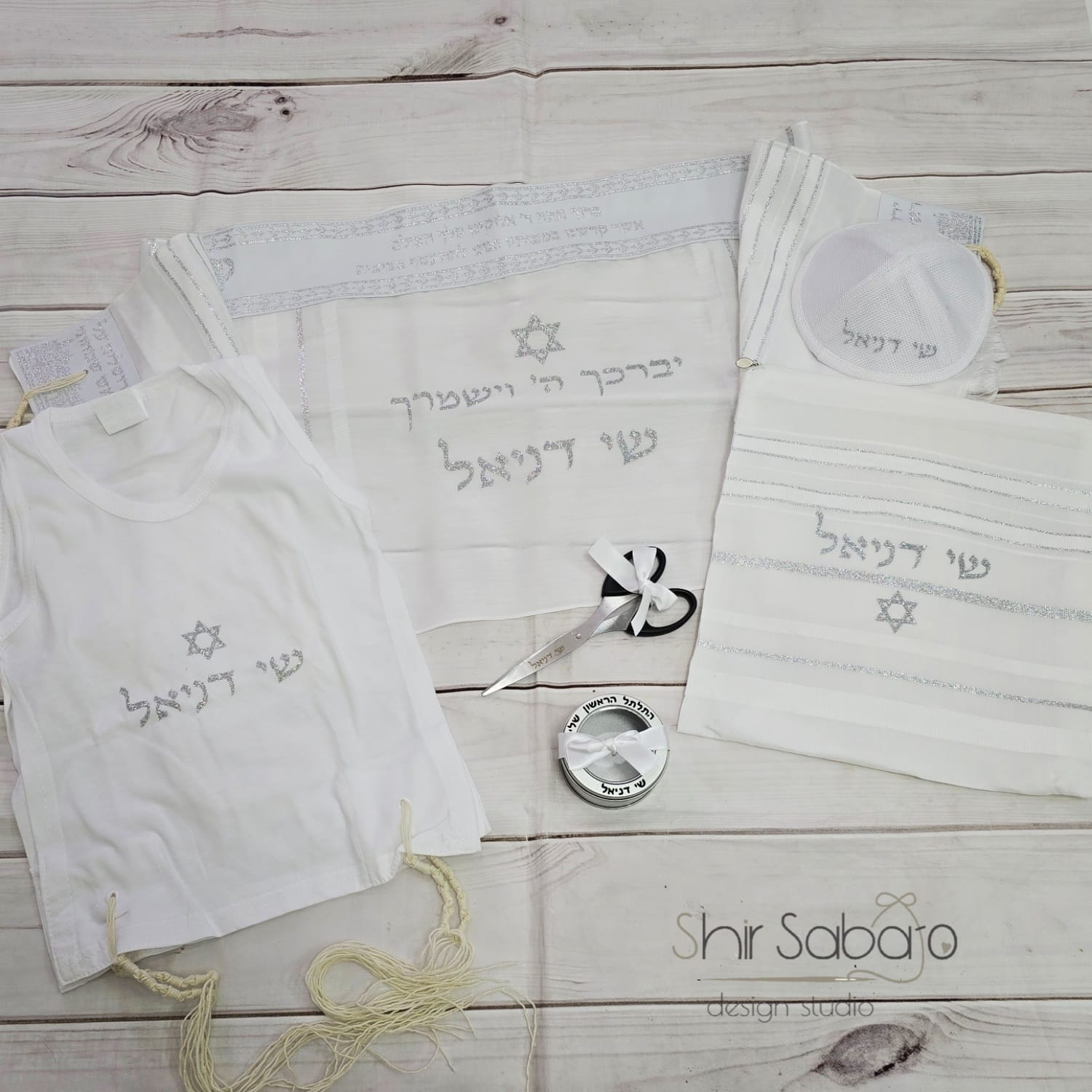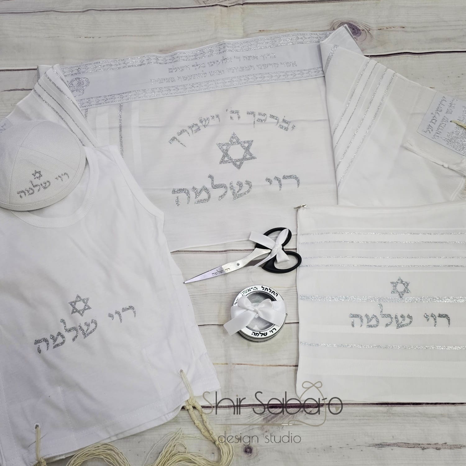 הסט מגיע עם הסט כולל טלית כשרה כיפה, נרתיק,ציצית,מספריים וקופסא לתלתל